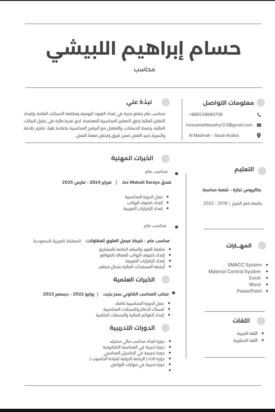 محاسب عام خبرة 4 سنوات عملت خزينة وعملاء وموردين ومخازن أقوم باثبات قيود اليوميه والترحيل الى الأستاذ المساعد وعمل ميزان المراجعة وقائمه الدخل والمركز المالي وعمل الميزانية عمل تحليل مصروفات وتكاليف أتقن الأكسيل والجوجل شيت واعمل على أنظمة Erp system متاح للشغل فوري مع إقامة سارية