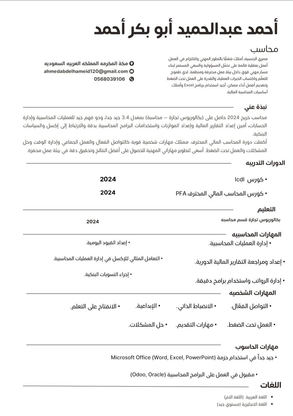 محاسب مصري الجنسية خريج 2024 جاهز للعمل في أي مكان في المملكة امتلك شغف التطور والالتزام، اعمل بعقلية المسؤولية لا الوظيفة، وأسعى لبناء مسار مهني قوي داخل بيئة عمل محترمة طموح، منظم، جاهز للتعلم والعمل تحت الضغط، وأسعى لاكتساب الخبرة العملية وتقديم أفضل أداء ممكن. اجادة Excel وأساسيات المحاسبة المالية