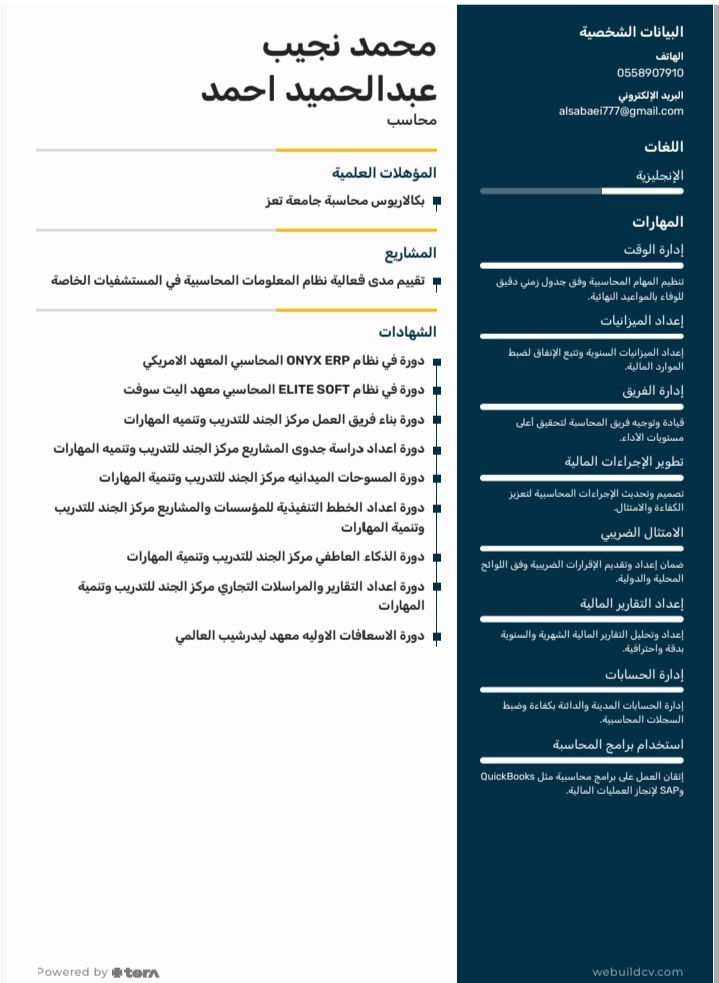 محاسب باحث عن وظيفة محمد نجيب عبد الحميد أحمد - يمني بكالوريوس محاسبة خبرة سنتين في معرض دبي للبطاريات - تعز دورات في Ones Pro و T Soft