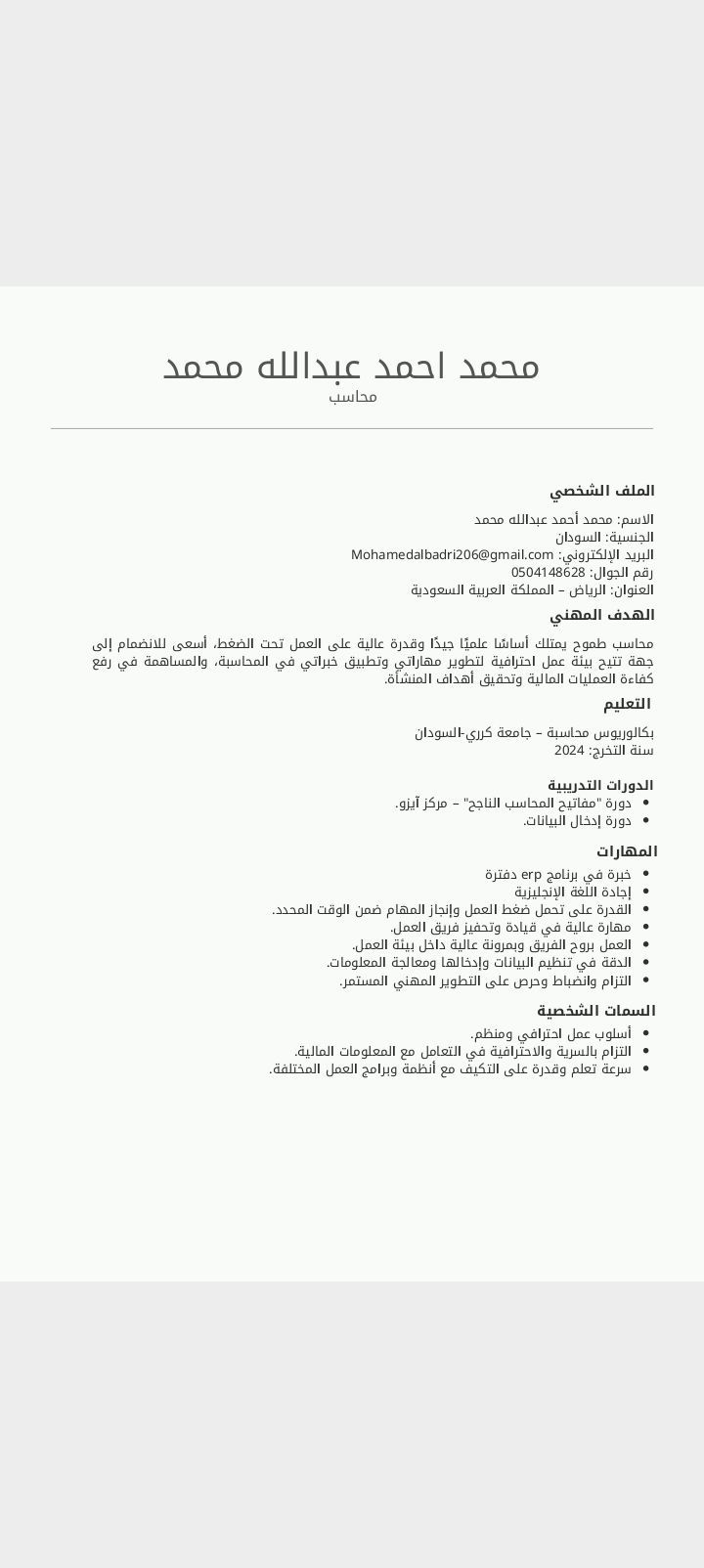 محاسب حديث تخرج من السودان أسعى للانضمام الى مؤسسة تتيح لي ابراز وتطوير مهاراتي المحاسبية عملت على نظام ERP دفتره وامتلك رخصة سياقة وإقامة جديدة