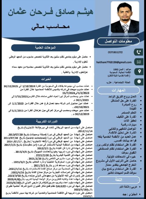 محاسب يمني خبرة خمس سنوات أجيد تسجيل العمليات الماليه اليوميه على البرامج المحاسبية واعداد التقارير اليوميه اللازمة والشهريه وعمل الاقرار الضريبي، خبرة في استخدام برامج الأوفيس مثل Excel وغيره كماهوا موضح في السيفي المرفق جاهز للعمل فورا