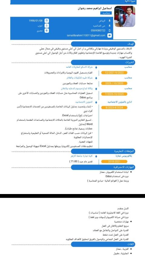 محاسب مصري حاصل على بكالوريوس تجارة خريج عام 2021 جامعة الأزهر 1 - محاسب لدى شركة ابداع مرسوم في تسجيل العمليات المحاسبية باستخدام (ERP) Odoo محاسب لدى شركة اتاسكو للمقاولات العامة القيام بتسجيل القيود اليومية وتسجيل المصروفات والايرادات 2 - محاسب لدى شركة طيبة للتكييف والفلاتر متابعة حسابات العملاء وحسابات الموردين. 3 - الشؤون الاجتماعية متابعة تسجيل بيانات الخاصه بالمستفيدين باستخدام الأكسيل