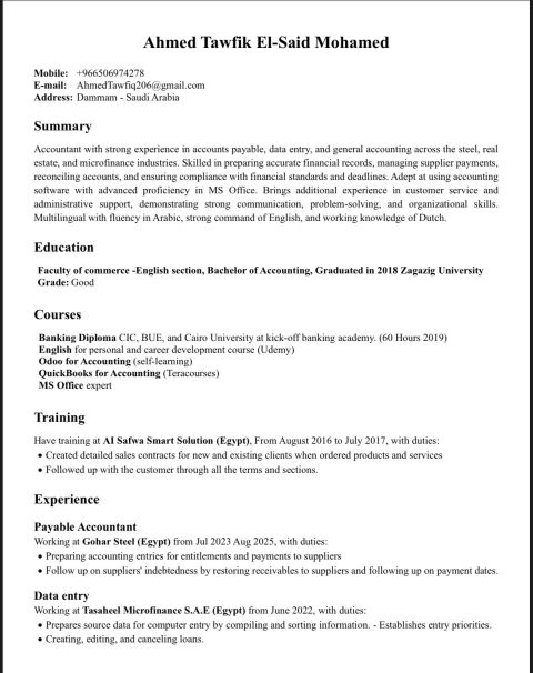 أنا محاسب ابحث عن فرصة عمل مناسبة في مجال المحاسبة والإدارة المالية، ولدي خبرة عملية تزيد عن 5 سنوات في اعداد القوائم المالية، واعداد التقارير الشهرية والسنوية، والمطابقات البنكية، واعداد القيود اليومية، اضافة الى التعامل مع ضريبة القيمة المضافة. أحمل بكالوريوس تجارة خارجية، وأتميز بالدقة والالتزام والقدرة على التنظيم والعمل وفق المعايير المحاسبية الدولية. خبرة قوية في استخدام برامج ERP وexcel