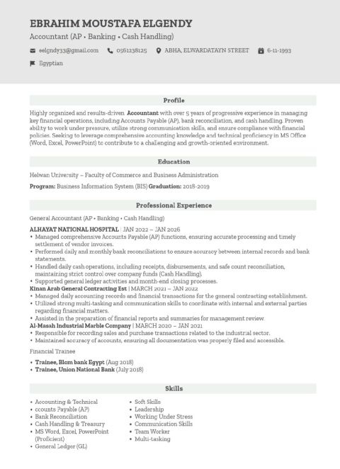 محاسب بخبرة تزيد عن 5 سنوات في الحسابات الدائنة، التسويات البنكية، والتعامل النقدي. متميز في الدقة، والعمل تحت الضغط، واعداد التقارير المالية. امتلك مهارات قوية في التواصل، واتقان برامج MS Office، وأسعى للمساهمة بخبرتي في بيئة عمل احترافية تدعم النمو والتطوير