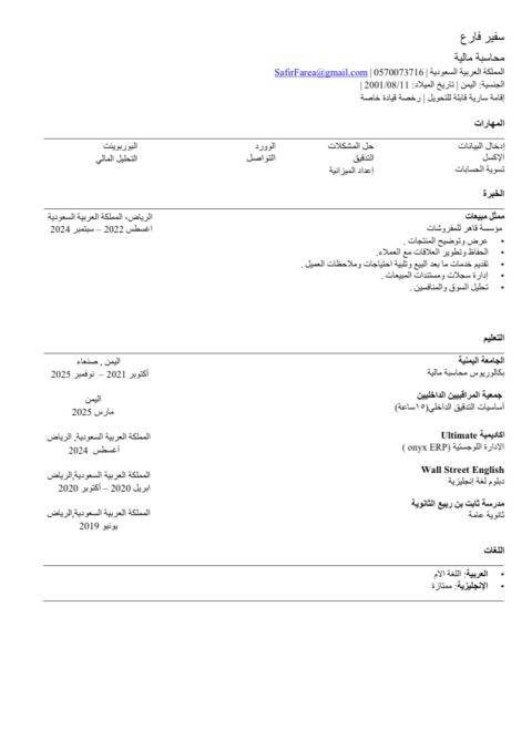 محاسب مالي دقيق يتمتع بخبرة قوية في المحاسبة اليدوية والالكترونية، واعداد القوائم المالية، والتحليل المالي، والمراجعة الداخلية. يمتلك كفاءة عالية في التعامل مع الأنظمة المحاسبية الحديثة مثل Oracle E Business Suite وSpiderbees ERP وGolden ERP، باإلضافة الى. Quickbooks متمكن من استخدام برامج Microsoft Office ويحمل شهادة ICDL، مع قدرة مميزة على العمل تحت الضغط وإدارة المهام المالية بكفاءة ودقة