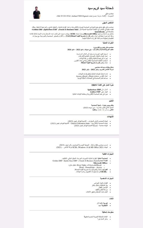 محاسب مالي دقيق يتمتع بخبرة قوية في المحاسبة اليدوية والالكترونية، واعداد القوائم المالية، والتحليل المالي، والمراجعة الداخلية. يمتلك كفاءة عالية في التعامل مع الأنظمة المحاسبية الحديثة مثل Oracle E Business Suite وSpiderbees ERP وGolden ERP، باإلضافة الى. Quickbooks متمكن من استخدام برامج Microsoft Office ويحمل شهادة ICDL، مع قدرة مميزة على العمل تحت الضغط وإدارة المهام المالية بكفاءة ودقة