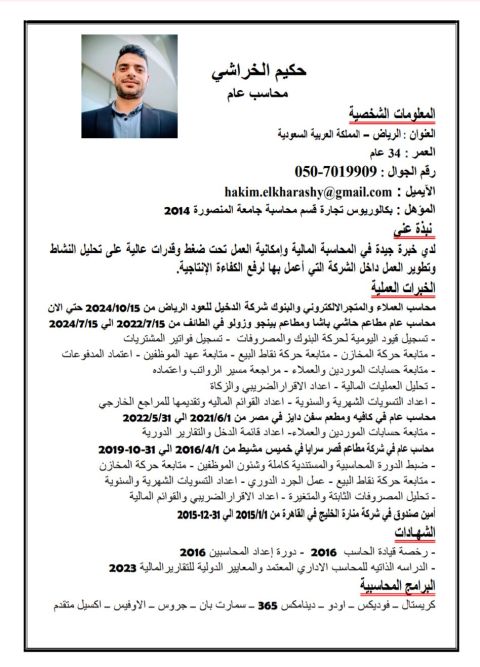 أنا محاسب خبرة 6 سنين بالمحاسبة منهم 4 سنين في السعودية، وسنتين في مصر وأعرف أتكلم انجليزي كويس جدا واشتغلت علي برنامج سماك وسكرا بس و I max المحاسبي ومتواجد في الرياض حاليا رقمي