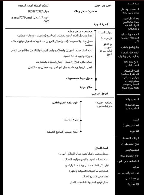 أحمد عمر. طموح وساعي الى المعرفة والعمل. دبلوم محاسبة. دبلوم حاسوب البرامج التطبيقية. ماهر في استخدام الحاسب الآلي. تواصل ممتاز مع جميع العملاء والموردون. دقة. خفة. مهارة. متابعة الحسابات. تدقيق في العمل. أمين مخازن. مستودعات. تسجيل فواتير المشتريات والمبيعات. مراجعة ودقة في التفاصيل. طريقة اقناع العميل اختصاصي. لا مانع العمل ككاشير. سنوات الخبرة الكافية إن شاء الله