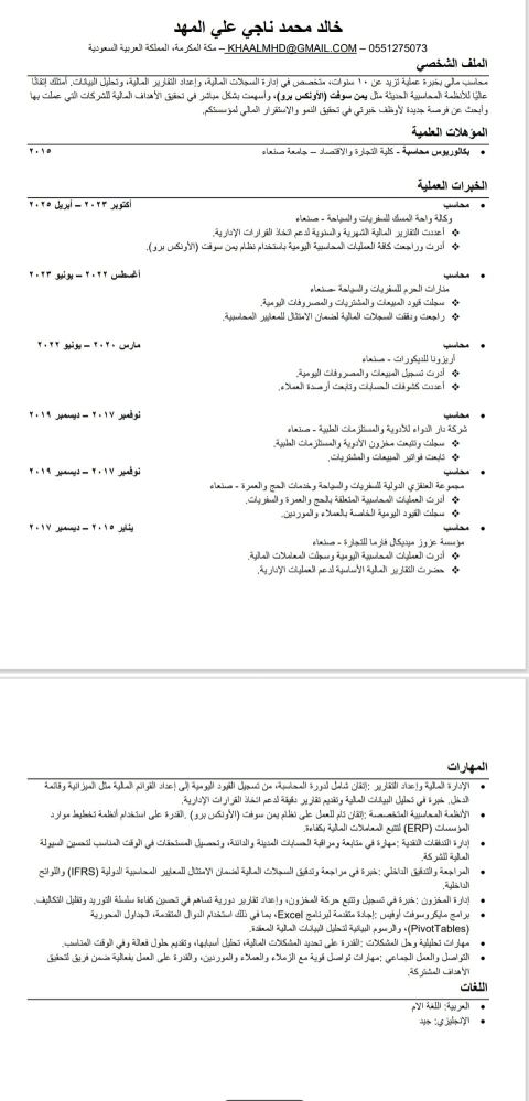 مدير مالي خبرة أكثر من عشرون عاما في الحسابات والمالية والتكاليف والبرامج المحاسبية ERP والقوائم المالية والزكاة والضريبة والتحليل المالي وحسابات المقاولات والشركات الصناعية - الرياض