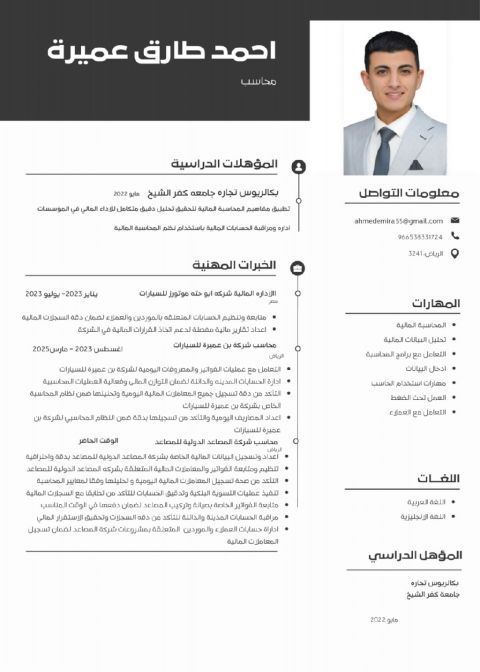 ابحث عن فرصة عمل مناسبة في مجال المحاسبة، بكالوريوس تجارة - جامعة كفر الشيخ - مايو 2022 اعمل في مجال المحاسبة ولدي خبرة عملية قوية في إدارة الحسابات المالية. التعامل مع الحسابات. متابعة الفواتير والمصروفات اليومية. اعداد التقارير المالية وتحليل البيانات. تنفيذ التسويات البنكية ومراجعة الحسابات. استخدام برامج المحاسبة وادخال البيانات بدقة، عملت محاسب بشركة بن عميرة للسيارات، وعملت بشركة المصاعد الدولية