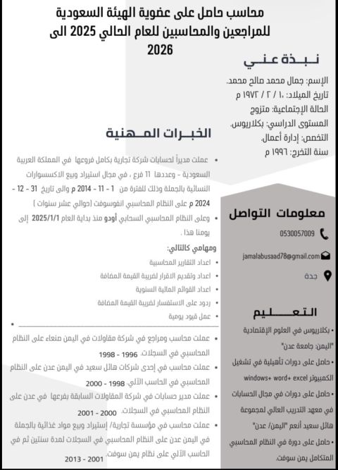محاسب عام متواجد في القصيم بريده بخبرة تزيد عن تسع سنوات في جميع مجالات الأعمال والخدمات المحاسبية متاح للعمل بدوام كلي جزئي أو عن بعد