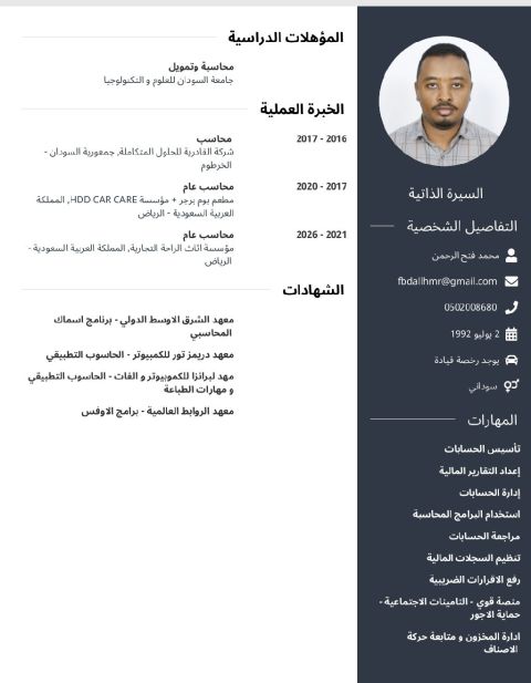 محاسب ومطور أنظمة محاسبيه سوداني الجنسية حاصل على درجة البكالوريوس في المحاسبة ولدي خبرة في انشاء وتطوير الأنظمة المحاسبية وكذلك المبيعات، اعداد القيود اليومية، القوائم المالية، التعامل مع البرامج المحاسبية أتميز بالدقة في العمل، والقدرة على التنظيم والمتابعة، وأسعى دائما لتطوير نفسي بما يخدم أهداف المنشأة