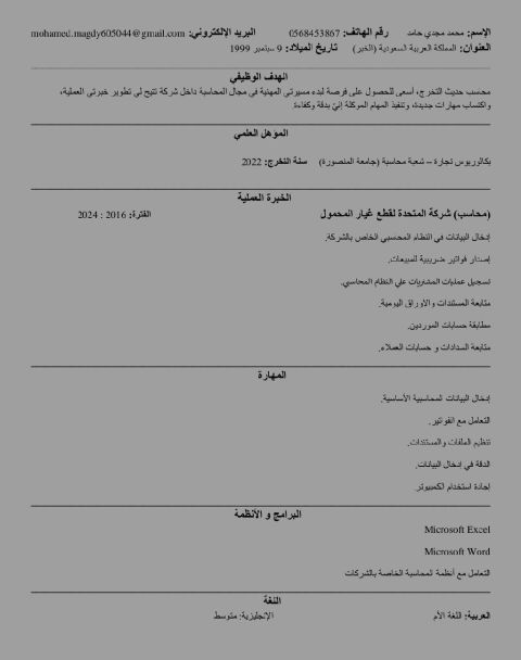 محاسب مصري حديث التخرج متواجد في الخبر، لدي معرفة جيدة بالمحاسبة المالية وأجيد استخدام Microsoft Excel اسعي للحصول علي فرصة عمل مناسبة لاكتساب الخبرة العملية وتطوير مهاراتي المهنية، متاح للعمل فورا