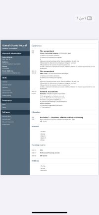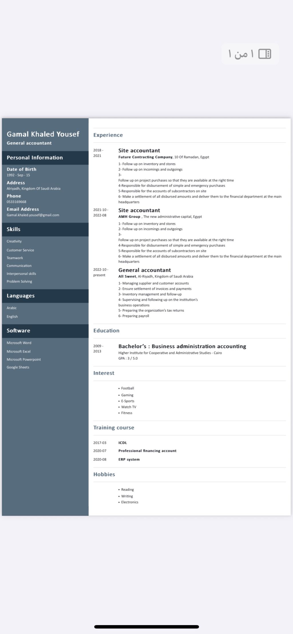 تحية طيبة وبعد الاسم / جمال خالد يوسف السن / 32 سنة المهنة / محاسب عام الجنسية / مصري الخبرة / خبرة أكثر من 5 سنوات بمجال المقاولات كمحاسب موقع حاليا متواجد بالمملكة العربية السعودية بمدينة الرياض بوظيفة محاسب عملاء وموردين لدى مؤسسة الحلا كله للحلويات والمكسرات رقم الهاتف / رقم واتساب / متاح وجاهز لنقل كفالة والإقامة سارية