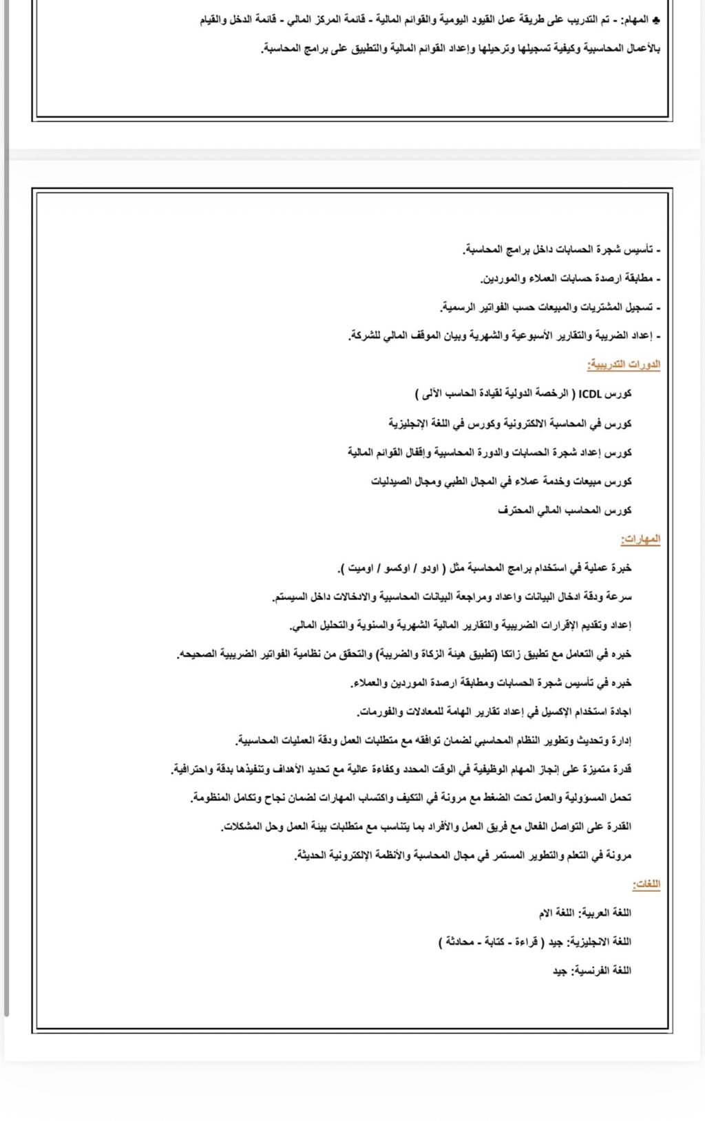 ابحث عن عمل أنا محاسب أول بكالوريوس تجارة انجليزي قسم المحاسبة. خبرة في برامج ERB System (أودو) أوكسو) أوميت) خبرة في القوائم المالية والتقارير. خبرة في مراجعة البيانات الماليه بدقة. خبرة في الاقرار الضريبي وبرنامج زاتكا للتحقق. خبرة في مطابقة أرصدة الموردين والعملاء. خبرة في البنوك ومراجعة نقاط بيع الفروع إن وجدت. متواجد في الرياض. وليس علي رأس عمل (متفرغ) إقامة سارية جاهز للعمل والانتقال