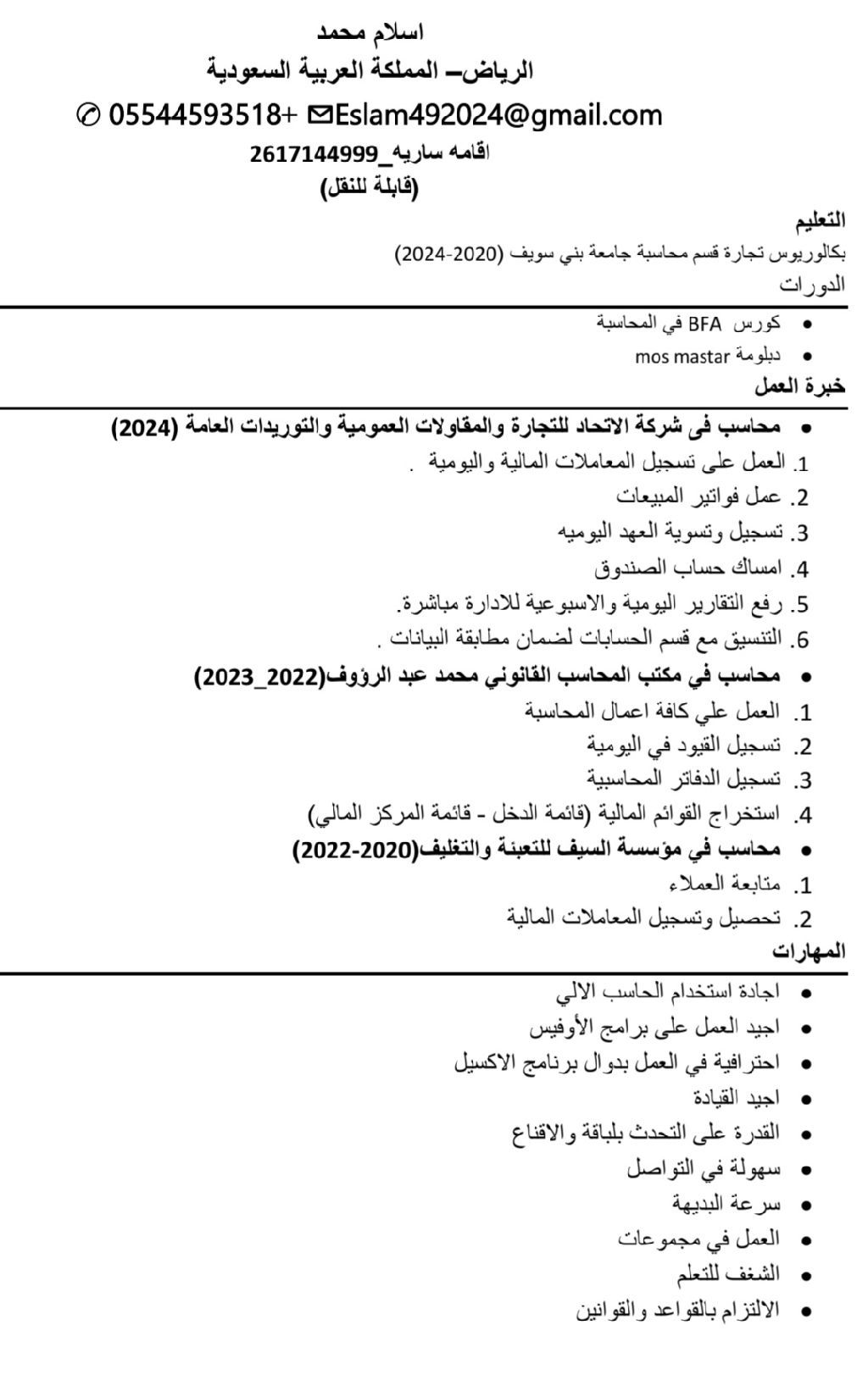 محاسب حديث التخرج مصري الجنسية مقميم في الرياض ومتاح التنقل أي مكان داخل اللمملكة أجيد التعامل مع فواتير المبيعات والمشتريات وعمل القيود اليومية ومتابعة العملاء والموردين معرفة جيده في Excel / word إقامة سارية قابلة للنقل