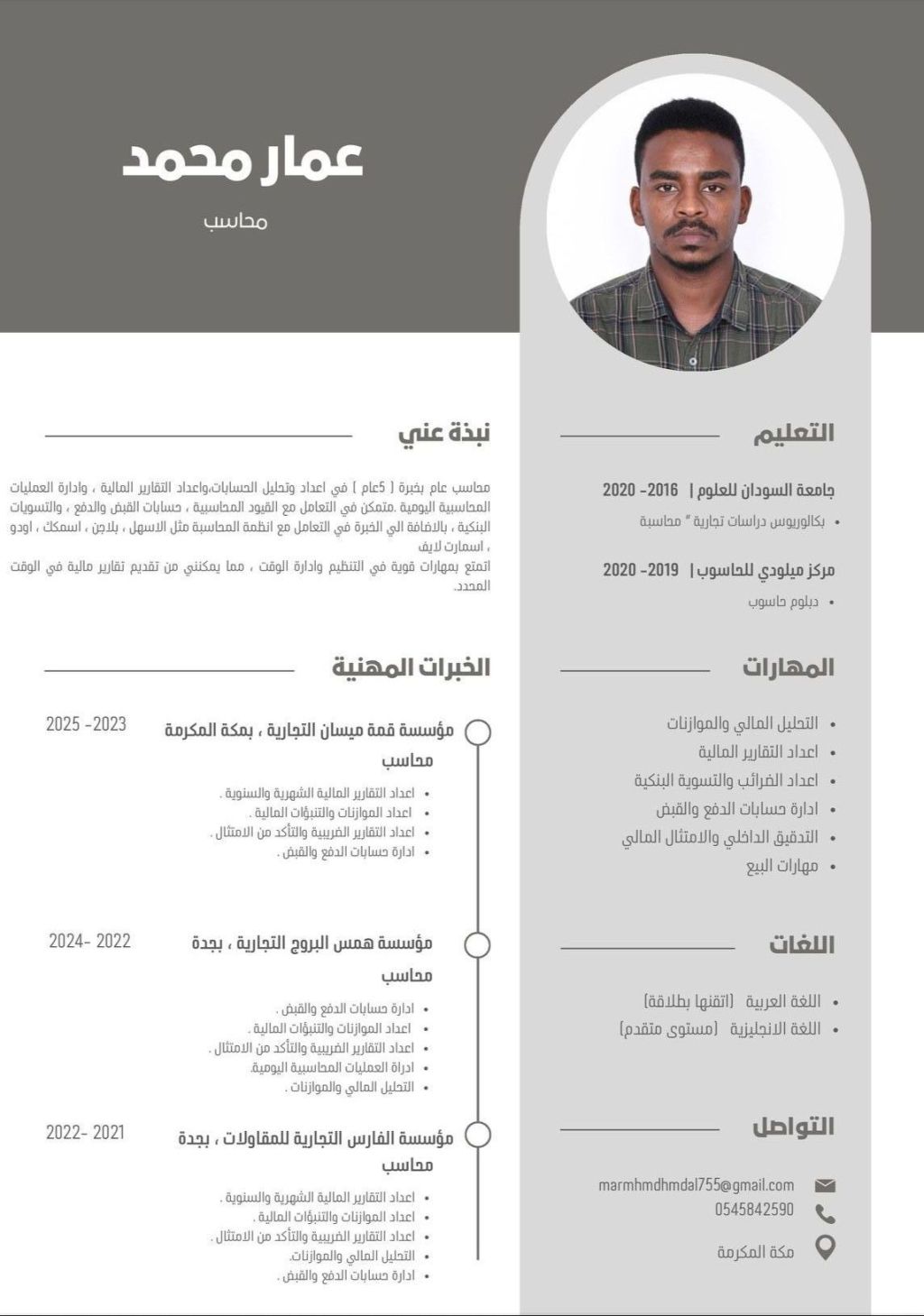 محاسب عام بخبرة 5 عام في اعداد وتحليل الحسابات، واعداد التقارير المالية، وادارة العمليات المحاسبية اليومية. متمكن في التعامل مع القيود المحاسبية، حسابات القبض والدفع، والتسويات البنكية، بالاضافة الى الخبرة في التعامل مع أنظمة المحاسبة مثل الأسهل، بلا جن، أسمكك، أودو، اسم أرت لايف أتمتع بمهارات قوية في التنظيم وادارة الوقت، مما يمكنني من تقديم تقارير مالية في الوقت المحدد