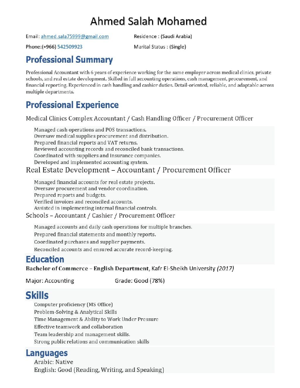 محاسب خبرة 5 سنوات في المجال الطبي أرغب في نقل كفالة