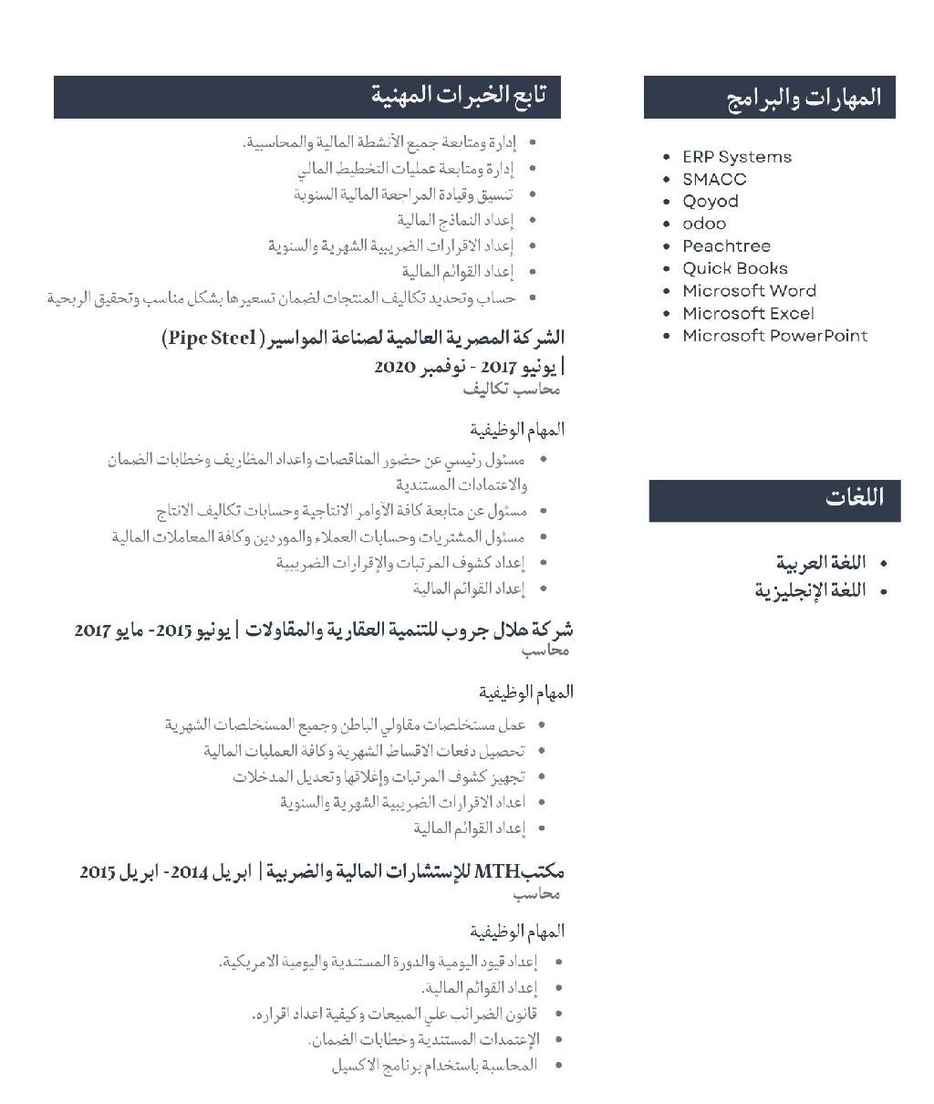 رئيس حسابات خبرة عدد 3 سنوات في شركة مساكن هاجر العقارية داخل المملكة العربية السعودية خبرة في اعداد دراسات الجدوى للمشاريع بكافة أنواعها واعداد نماذج دراسات جدوى المشاريع وتسعير الأراضي والشقق والفلل والأدوار السكنية والتعامل مع شركات التمويل والبنوك والصناديق الاستثمارية واعداد الموازنات التقديرية والفعلية للمشاريع خبرة جيدة في مشاريع البيع على الخارطة (وافي) ونظام المساهمات العقارية