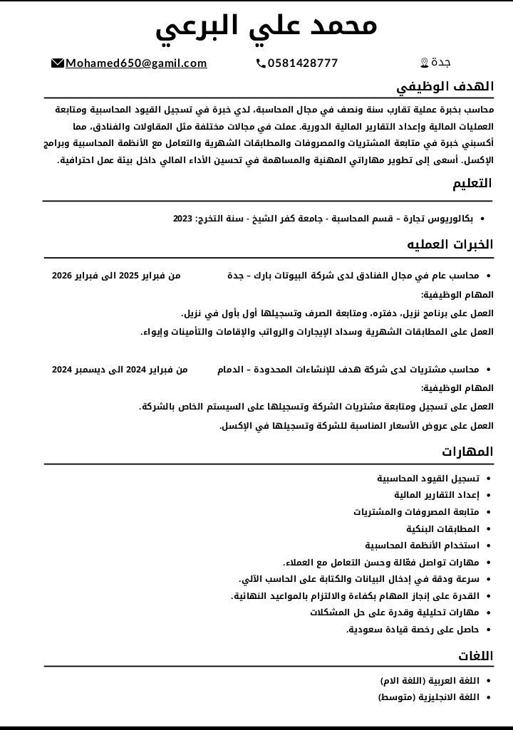 محاسب مصري خبرة سنة ونصف لدي العديد من الخبرات في البرامج المحاسبية والاكسل ولدي رخصة قيادة وإقامة سارية قابلة ل النقل جاهز للعمل فورا