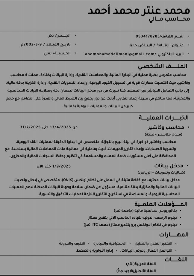 محاسب يمني خريج جامعة تعز خبرة داخل المملكة العربية السعودية على نظام الأونكس برو ك مدخل بيانات وسدادات موردين وإدارة مخزون وخبرة في الأقفال اليومي وخبرة محاسب في مول ملابس على نظام أنفوا سوفت وخبرة على كاشير أونكس وكاشير أنفوا سوفت الموقع الحالي مكة ابحث عن فرصة عمل لبقيه التفاصيل تواصل
