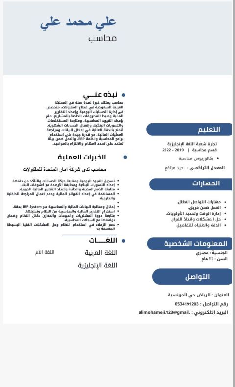 رئيس حسابات خبرة بالمقاولات والمواد الغذائية بالمملكة ولدي خبرة بالامور المالية والادارية
