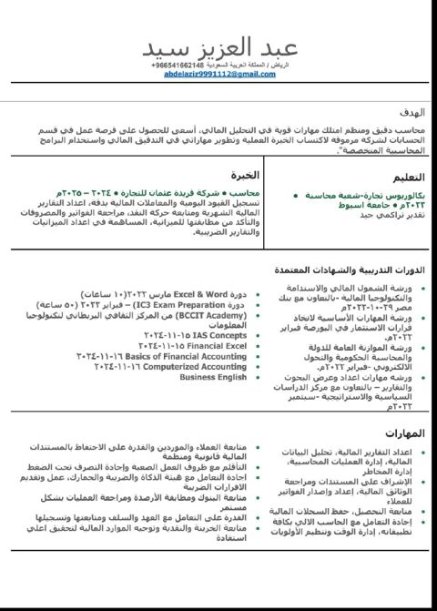 أنا مالك عبد الرحيم، محاسب مبتكر ومتحمس مع سنتين من الخبرة في المحاسبة والمالية. امتلك مهارات قوية في إدارة الحسابات، تحليل البيانات المالية، واعداد التقارير. أنا ملتزم بتقديم أداء متميز وتحقيق الأهداف المالية للمؤسسة. الجنسية يمني المقيم في المملكة العربية السعودية لماذا أنا مناسب لهذه الوظيفة - خبرة في المحاسبة والمالية - مهارات تحليلية قوية - القدرة على العمل تحت الضغط - فريق عمل متميز أنا