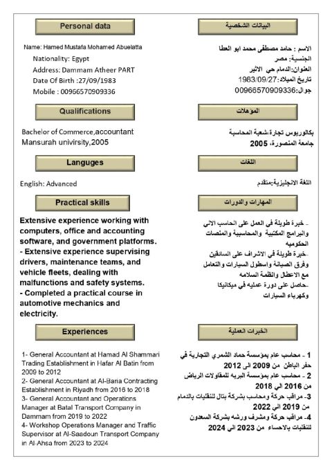 حاصل على بكالوريوس تجارة في المحاسبة وإدارة الأعمال، ولدي خبرة تزيد عن 10 سنوات خلال مسيرتي المهنية، عملت في أقسام الحسابات من تسجيل المبيعات والمشتريات والضرائب والزكاة والتقارير المالية، والموارد البشرية من توظيف وتدريب ونماذج ادارية والمنصات الحكومية وغيرهم، والأقسام الادارية كتنظيم الوقت والعمليات التشغيلية. اتمنى أن خبراتي ومهاراتي تجعلني مرشحا مناسبا معكم وأود أن أكون جزء من فريقكم