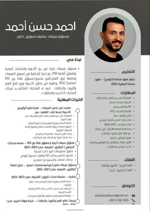أنا اسمي أحمد حسن خضر مصري عمري 26 سنة مقيم في الرياض ومعيا إقامة سارية قابلة للنقل ابحث عن فرصة عمل مناسبة