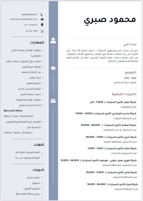 مكان الإقامة المنطقة الشرقية - المملكة العربية السعودية حالة الإقامة إقامة سارية المفعول رخصة قيادة سارية + سيارة خاصة الاستعداد للانتقال أي مدينة في المملكة الخبرات والمؤهلات خبرة 15 عاما في إدارة وتشغيل المطاعم، منها 19 عاما في المملكة العربية السعودية منذ 2006) خبرة واسعة في التأسيس والافتتاح للمطاعم (التخطيط، التجهيز، التوظيف، التشغيل) خبرة متميزة في استقدام