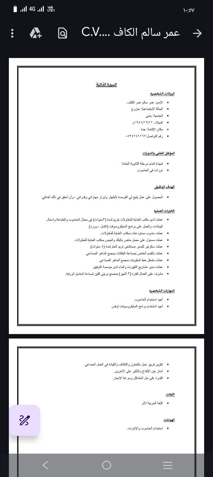 أنا عمر الكاف من حضرموت اليمن مقيم في جدة إقامة سارية ابحث عن عمل. عملت مدخل بيانات. وعملت سكرتير لمدير مستشفى حكومي في حضرموت عملت أمين مخازن عملت مشرف خط انتاج بمجمع صناعي عملت مدير إدارة مشاريع الكهرباء والماء وصيانة المباني عملت مشرف على العمال في مصنع بريتي كلين