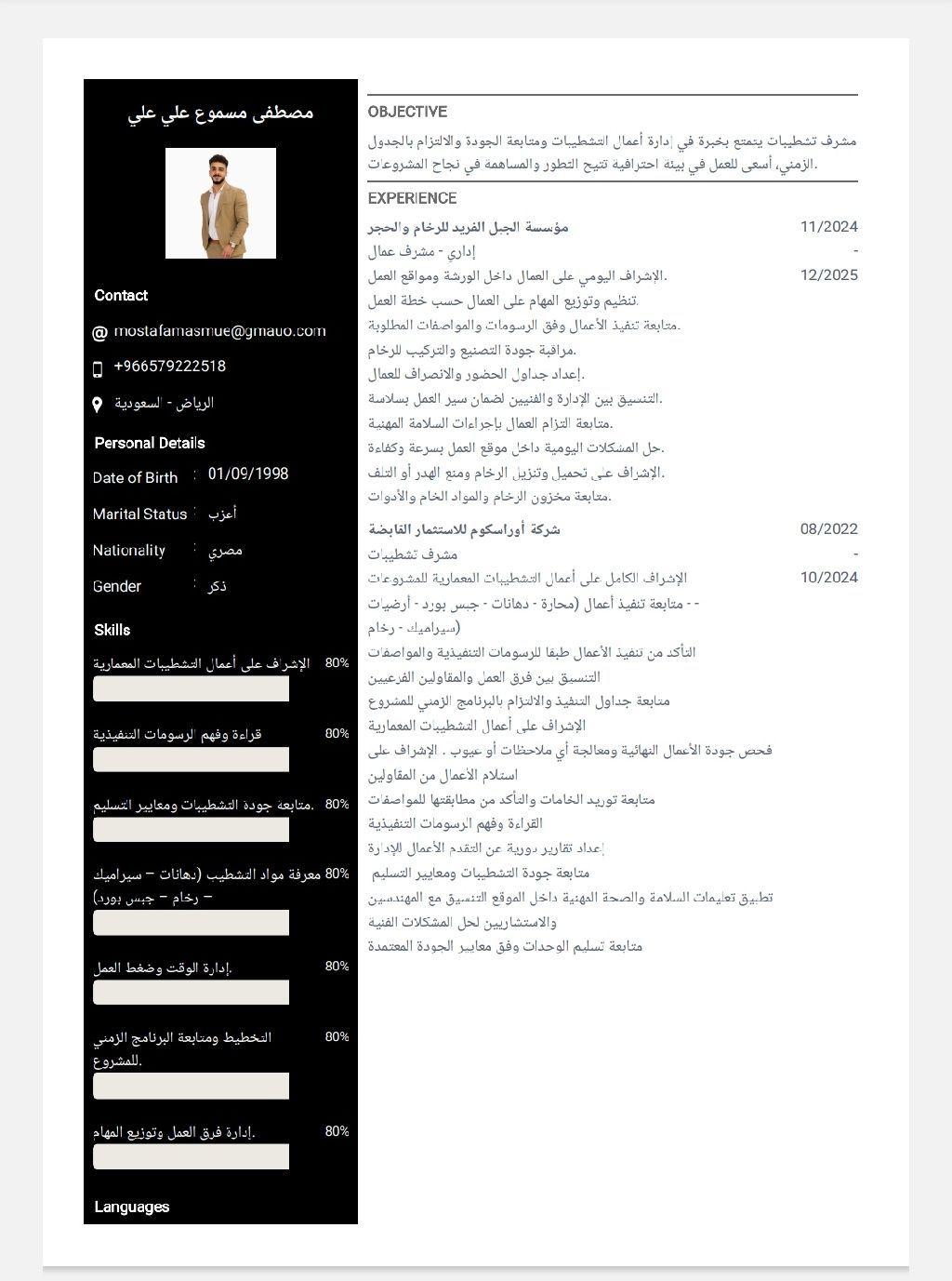 أنا مصطفى اعمل مراقب تشطيبات اشتغلت في مؤسسة جبل الفريد للرخم مشرف علي قص وتجهيز الرخام صناعي وطبيعي علي مهم شغل داخل الورشة أو معرض علي العمال في تجهيز أو قص الرخم مصريه والإقامة مهنية سوريا