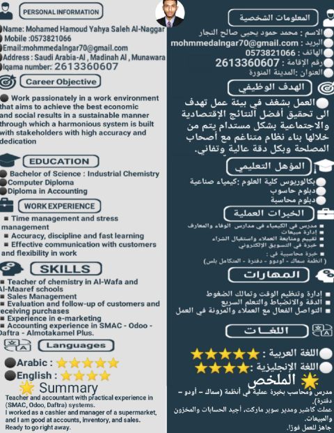 مصري الجنسية العمر 25 المؤهل ثانوية عامة عملت في الرياض أمين مستودع سنتين في مجال قطعات الألومينيوم لدي رخصة خاصه