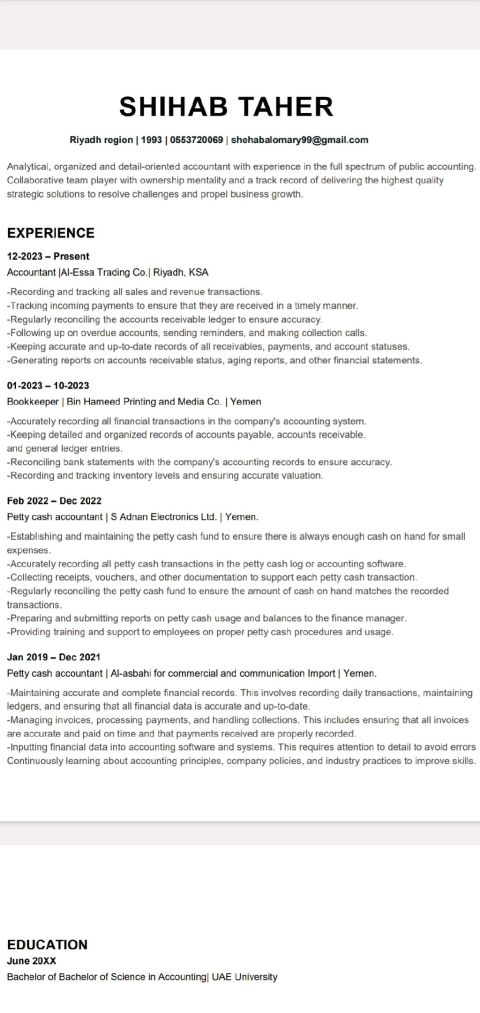 مشرف عام واداري لدي معرفة في مجال المحاسبة الالكترونية والقدرة على العمل على برامج Microsoft Office (Word, Excel, PowerPoint) القدرة على تنظيم وإدارة الأعمال المكتبية والادارية. الاشراف على العمال والموظفين. خبرة في إدارة النقل والحركة وصيانة السيارات