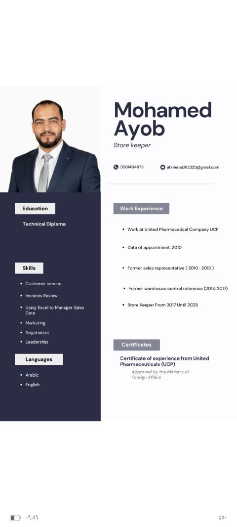 ابحث عن عمل أمين مستودع أو مندوب لاحدى الشركات الطبية خبرة في مجال الادوية كنت اعمل مدير مخازن لدى شركة المتحدة في مصر يوجد شهادة خبرة في هذا المجال متاح نقل كفالة