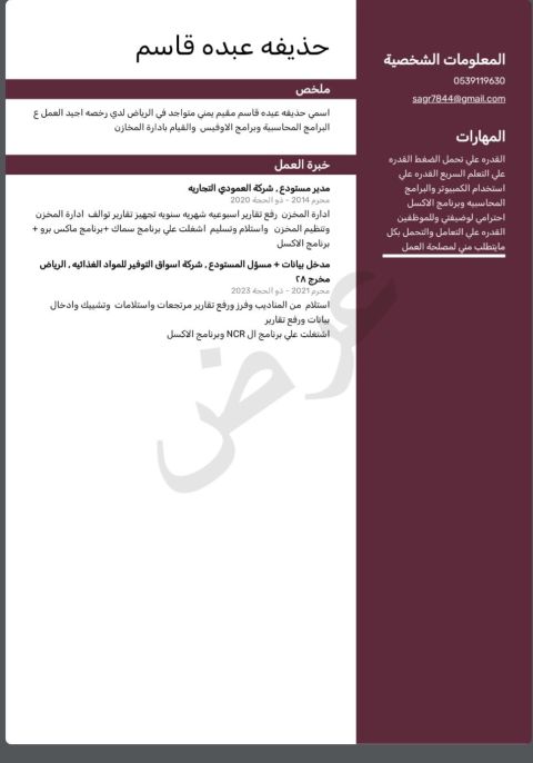 أمين مستودع لدي خبرة 6 سنوات في مجال مستلزمات رجالية، وإدارة المخزون وتنظيم المستودعات. أتقن العمل على منصات سلة ووورد بريس، ومتمكن من برنامج Excel. امتلك خبرة في إدارة المشتريات والتعامل مع الموردين باحترافية