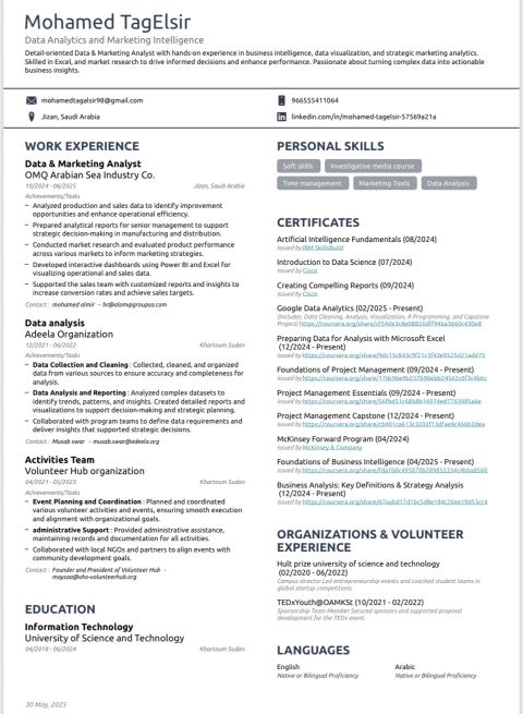 سوداني الجنسية خبرة في ادخال البيانات وتحليل البيانات وتحليل التسويق وادارة منصات التواصل الاجتماعي واعداد التقارير إقامة سارية خبرة 9 شهور داخل جازان