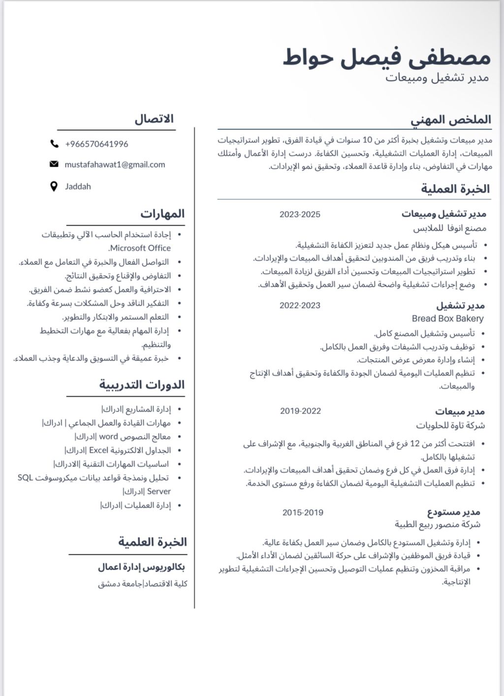 ابحث عن فرصة قيادية في إدارة التشغيل والمبيعات محترف بخبرة واسعة في ادارة التشغيل وتطوير المبيعات ابحث عن فرصة تتيح لي توظيف مهاراتي القيادية والاستراتيجية في تطوير الأداء وتحقيق النمو المستدام خبرة 10 سنوات