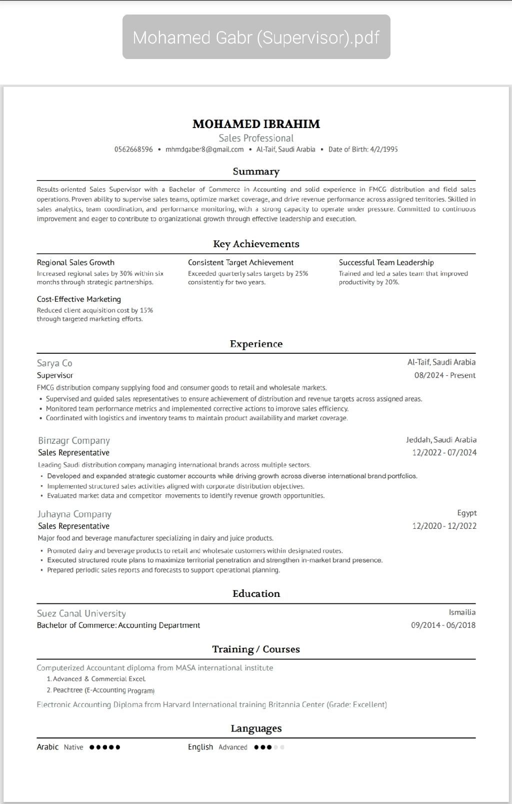 خبرة في مجال المبيعات واعمل حاليا في شركة ساريا كمشرف مبيعات ولدى خبرة في جدة والطائف