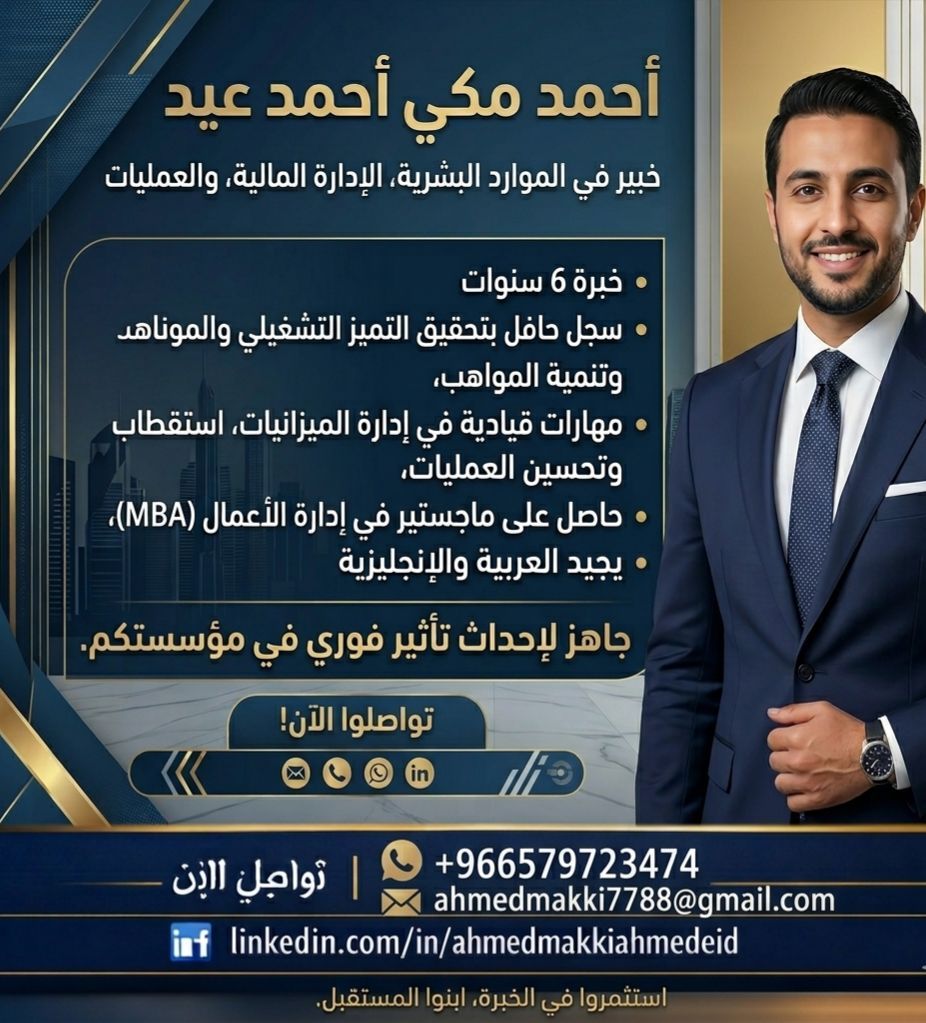 Ahmed Makki Ahmed Eid An expert in HR, Financial Management, and Operations with 6 years of experience. Proven track record in operational excellence and talent development. Possesses leadership skills in budget management, talent acquisition, and process optimization. Holds an MBA and is fluent in Arabic and English. Ready to make an immediate impact on your organization. Contact now