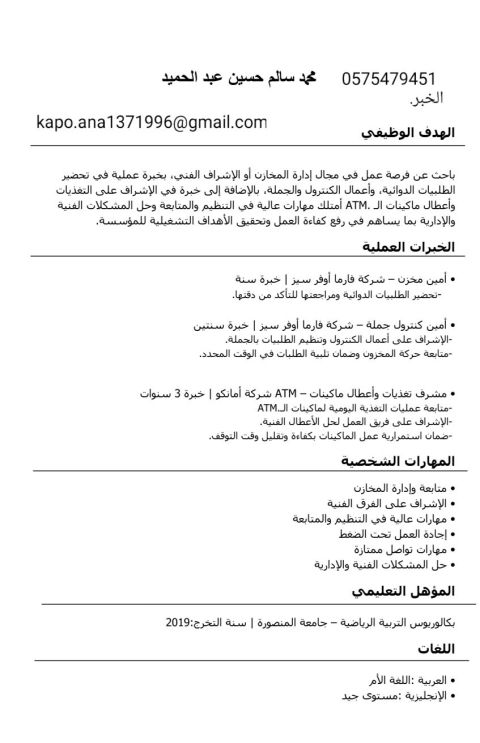 أنا اكرم محجوب سوداني الجنسية المؤهل الأكاديمي جامعي ابحث عن فرصة عمل في خدمة الزبائن أو كاشير أو مسؤول فرع في أي منشأة تجاريه وسبق لي العمل في مؤسسة في مجال اللحوم فترة 3 سنة وكنت مدير فرع أتميز تحمل ضغط العمل حسن التعامل مع الجمهور ولبق في التعامل ليس لدي مانع بالعمل في أي مجال ليس لدي مانع بالعمل في أي مكان بالمملكة وليس لدي مانع في نقل الكفالة يتوفر لدي رخصة قيادة سارية