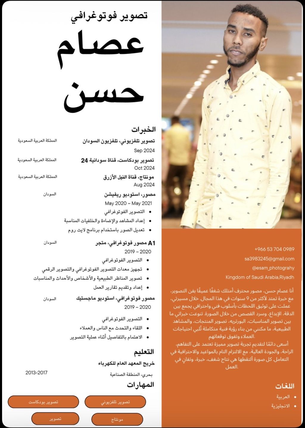 مصور فوتوغرافي سوداني الجنسية أملك إقامة المملكة العربية السعودية الإقامة سارية مفعول مصور فوتوفرافي وفيديو أجيد العمل الجماعي والفردي وتصوير جميع المناسبات والاحتفالات وأتحمل الضغط عمل مهم كان أملك رخصة قايده خاصه اشتغلت مناسبات عديدة من شركات داخل المملكة وخارج المملكة السعودية