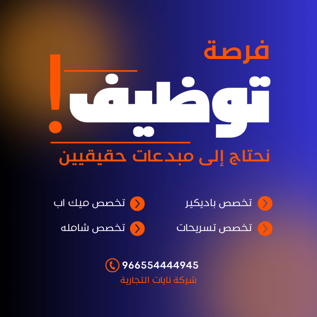 اعلان وظيفي مطلوب موظفات لصالون تجميل نسائي في الطائف نحن في صالون تجميل نسائي في الطائف نبحث عن موظفات مبدعات ومحترفات في التخصصات التالية بديكير ومنيكير. تسريحات عالية المستوى. مكياج لكل الأنواع. شامله. الشروط نرحب بجميع الجنسيات. سيتم إجراء مقابلة ثم تجربة عملية قبل بدء التوظيف. موقعنا الطائف - حي الحلقة. للمهتمات، يرجى التواصل معنا لتحديد موعد المقابلة