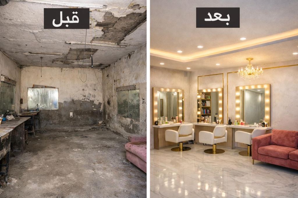 تشطيب صالون نسائي بأقل التكاليف نحول المكان من قبل بعد بشكل أنيق وجاهز للعمل تشطيب كامل للصالون ديكور بسيط وراقي اضاءة مناسبة ترتيب وتقسيم المساحة كل هذا بأقل التكاليف نتيجة احترافية وسريعة للتواصل