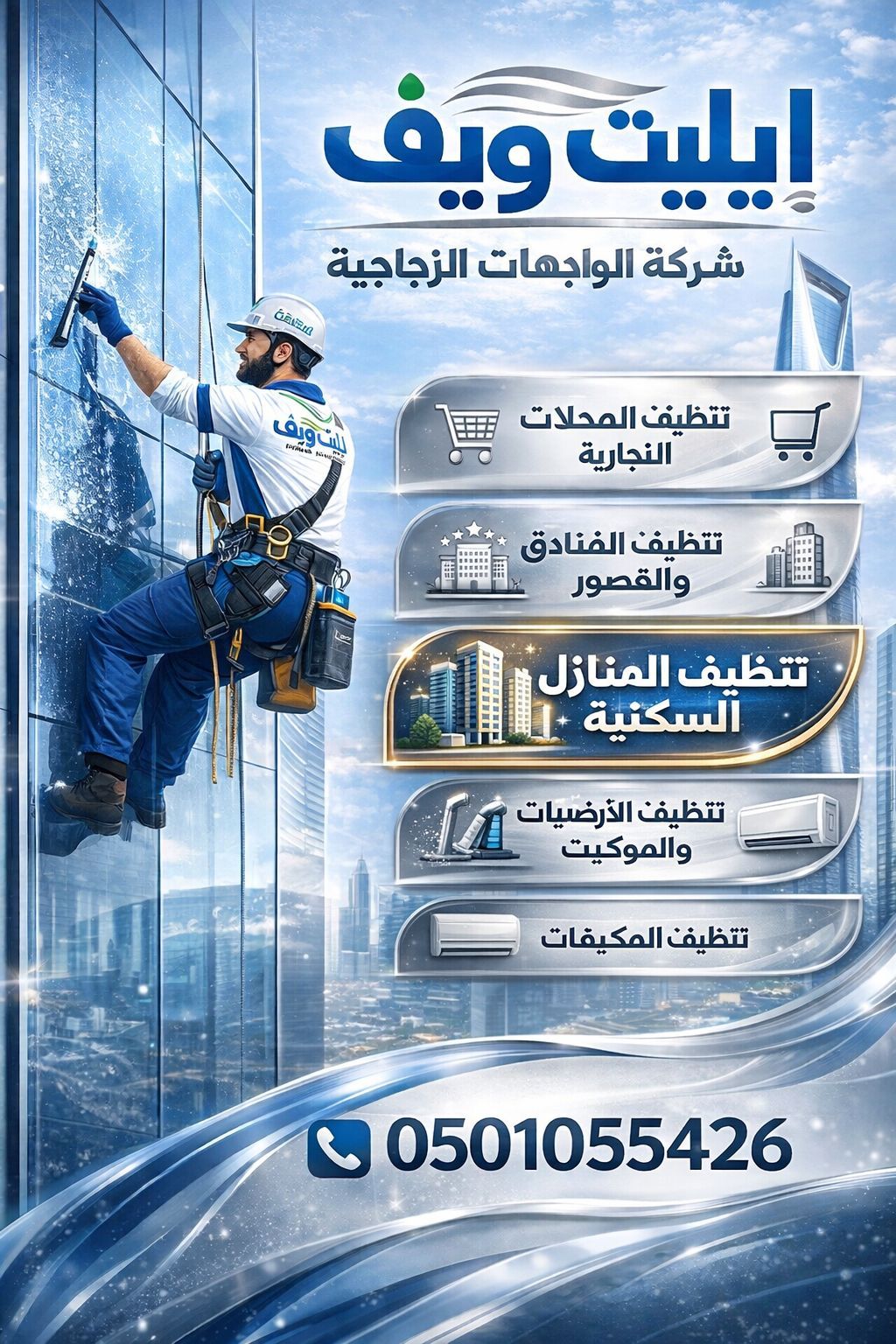 A company specializing in cleaning glass facades, residential apartments, hotels, villas, palaces, and commercial shops at the lowest prices