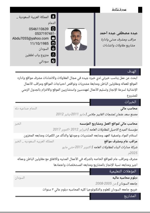 مهندس ميكانيكي سوداني الجنسية مسجل لدى الهيئة السعودية للمهندسين خبرة أكثر من 18 سنة في مجال إدارة ورش وصيانة المعدات والأليات الثقيلة والشاحنات والسيارات - خبرة في السودان والسعودية والبحرين