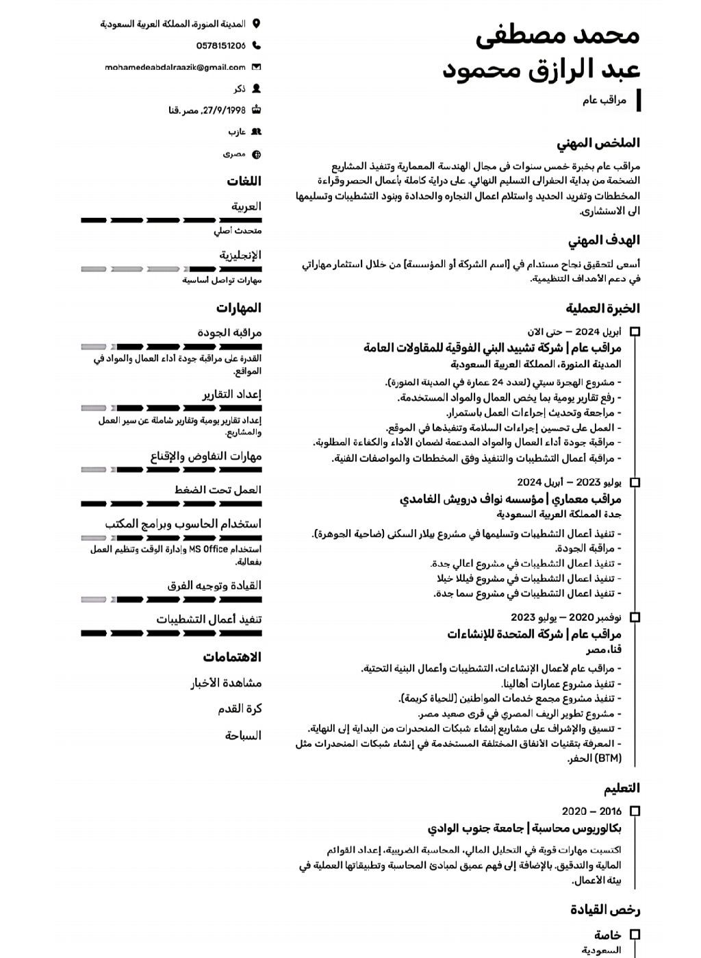مراقب عام لدى خبرة 5 سنوات في مجال المقاولات والانشاءات وتنفيذ المشروعات الضخمه من بداية الحفر الى التسليم النهائي على دراية كاملة بي أعمال الحصر وقراءة المخططات وتفريد الحديد واستلام النجارة والحدادة وتسليمها الى الاستشاري. على دراية كاملة بي استلام جميع بنود التشطيبات وتسليمها الى الاستشاري. القدرة على توزيع العمالة ومتابعة كافة الأعمال واليوميات