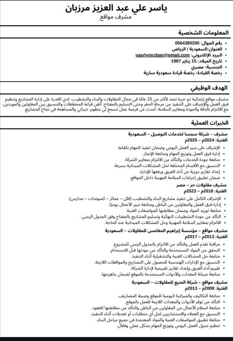 اسمي وحيد أحمد مصري الجنسية مقيم في جدة اعمل مشرف صحة وسلامة مهنية في مجال الإنشاءات بخبرة تتجاوز 15 عاما في الامارات ومصر والسعودية