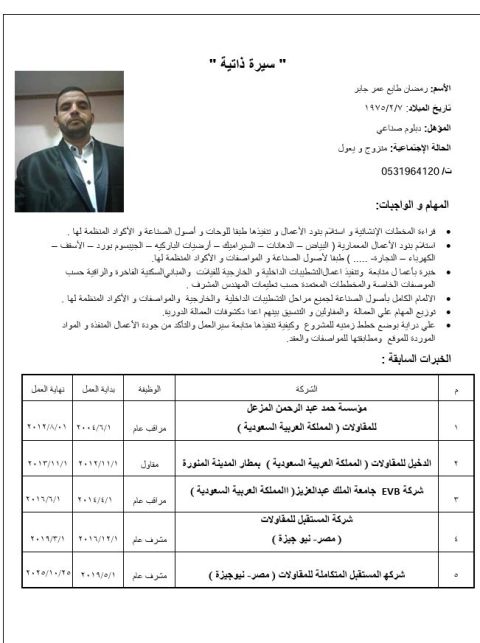 باحث عن عمل لوظيفة مساح خبرة في مجال الإنشاءات البنيه التحتية وخبرة في عمل الوجهات الزجاجية والأبراج وعمل اشراف في الموقع اشتغلت في شركات المقاولات ومكاتب هندسية مرموقة في المملكة العربية السعودية ومصر