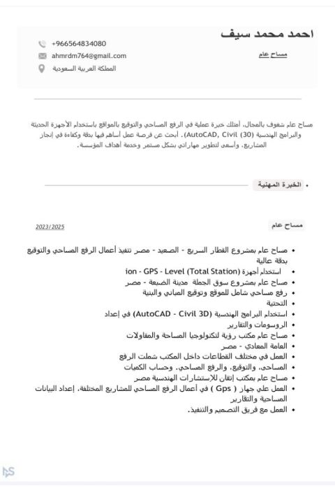 اسماعيل أحمد مساح عام مساح خبرة 10 سنوات خارج وداخل المملكة وجاهز للعمل. خبرة في مشاريع الإنشاءات والطرق والبنية التحتية وحساب الكميات، والعمل على جميع اجهزة GPS / Level/ Total Station وبرامج AutoCAD وCivil 3D للتواصل